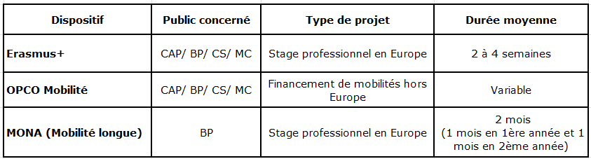 Stage de 1 mois en entreprise pour des jeunes volontaires en 1ère année BP cuisine et les BP service. Ce projet les menera a réaliser une nouvelle mobilité d’un mois en 2ème année.